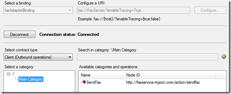§ xxxBroswseHandler.cs: This is where the end system is surfaced. i.e for my fax adapter, I am planning to surface the ‘SendFax’ as outbound operation, ‘ReceiveFax’ as inbound operation. To surface a limited rather static operation, essentially just evaluate the passed in NodeID and return a list of MetadataRetrievalNode variables. The MetadataRetrievalNode variable will describe the method name, direction. I used the xml namespace in representing the node ID, i.e. the SendFax operation node ID is http://faxservice.mypoc.com/action/sendfax