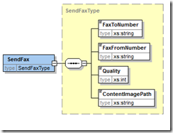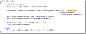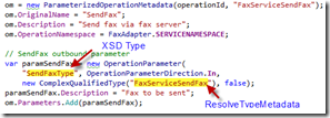§ xxxResolveHandler.cs: The framework calls this class to resolve the adapter contracts. For BizTalk, this is where the magic of incoming and outgoing schema generated. For my case, I have a SendFax as inbound type, SendFaxResponse as response type.